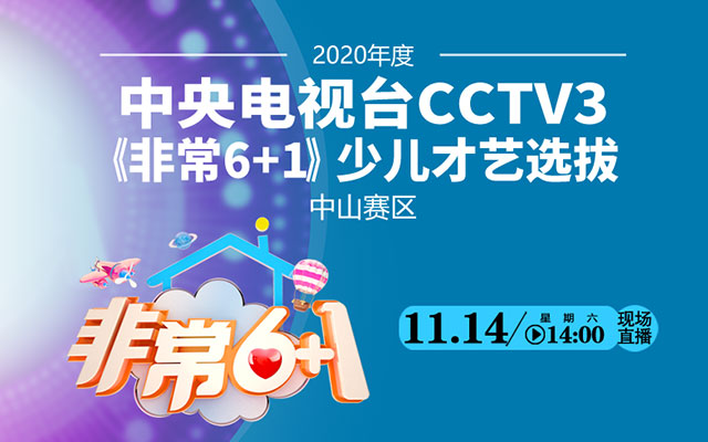 2020年度中央電視臺CCTV3《非常6+1》少兒才藝選拔中山賽區(qū)將于11月14日下午2點(diǎn)舉行,中山日報報業(yè)集團(tuán).中山網(wǎng)全程直播,敬請關(guān)注!