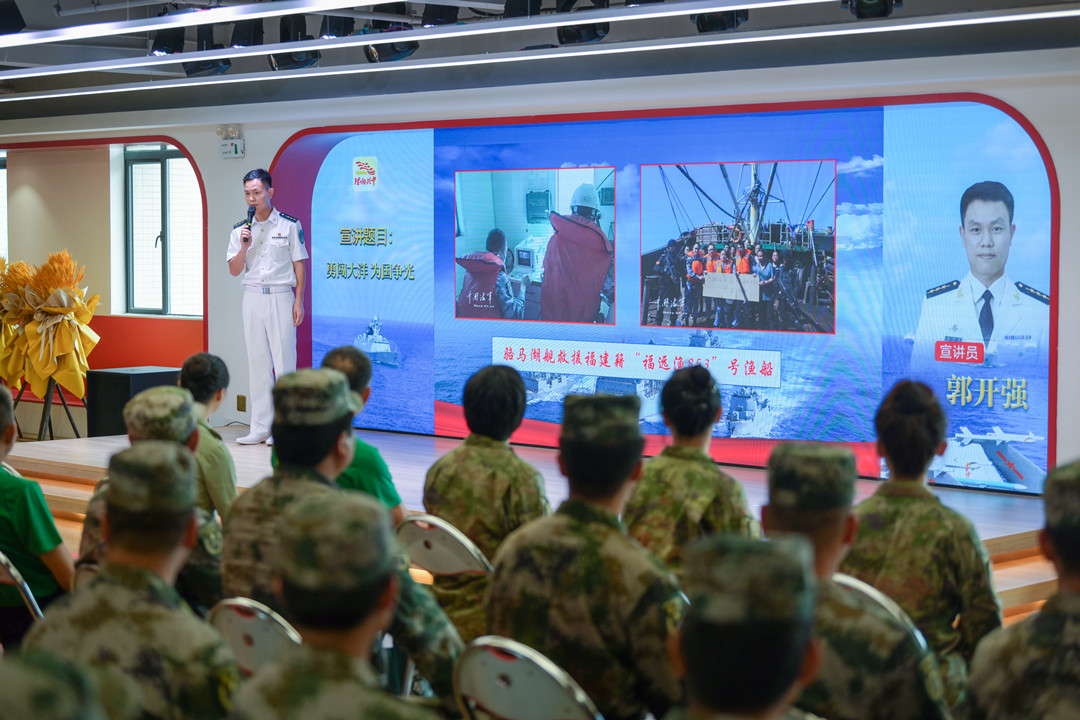 郭開強:勇闖大洋 為國爭光 2008年12月,應聯(lián)合國授權請求,奉中央軍委命令,南海艦隊武漢艦、??谂?、微山湖艦組成第1批護航編隊,拉開了人民海軍舉世矚目的亞丁灣、索馬里護航序幕,這是自600多年前鄭和下西洋以來,中國真正意義上的遠海非戰(zhàn)爭軍事行動,開啟了人民海軍從“黃水”駛向“藍水”的壯麗航程。 91878部隊郭開強干事為大家?guī)碇黝}宣講《勇闖大洋 為國爭光》。 郭開強介紹—— 迄今為止,人民海軍已累計派出44批100余艘次艦艇參加亞丁灣、索馬里海域護航,完成1500多批7000余艘中外船舶護航任務,解救、接護各類船舶近百艘,其中外國船舶超過50%。 護航官兵一次次直面生死、一次次化解危機、一次次挑戰(zhàn)極限,用忠誠與奉獻、責任與擔當,彰顯大國海軍形象,譜寫了人民海軍邁向世界一流海軍的新時代壯歌。 張長城分享軍旅故事。記者 易承樂 攝
