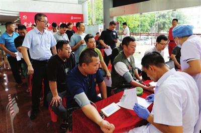 我市退役軍人踴躍報名參加無償獻血活動,大家正在接受獻血前血壓測量。記者 王云 攝