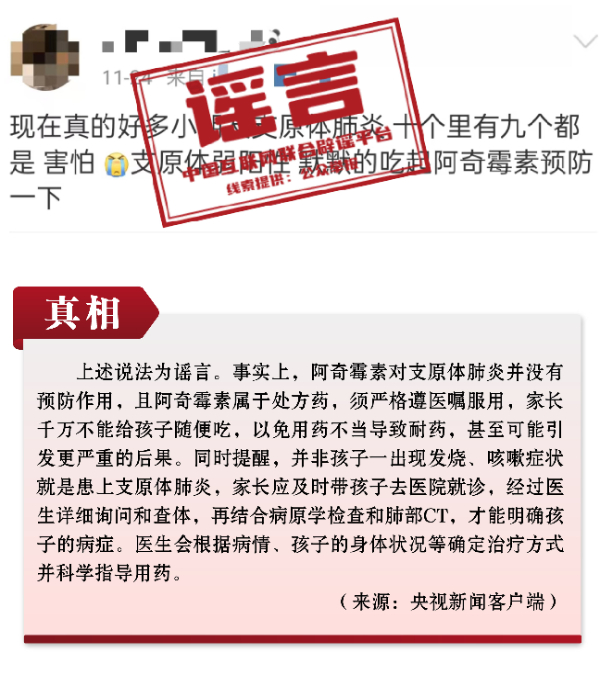 謠言2:可自行給兒童服用阿奇霉素,以預防支原體肺炎?