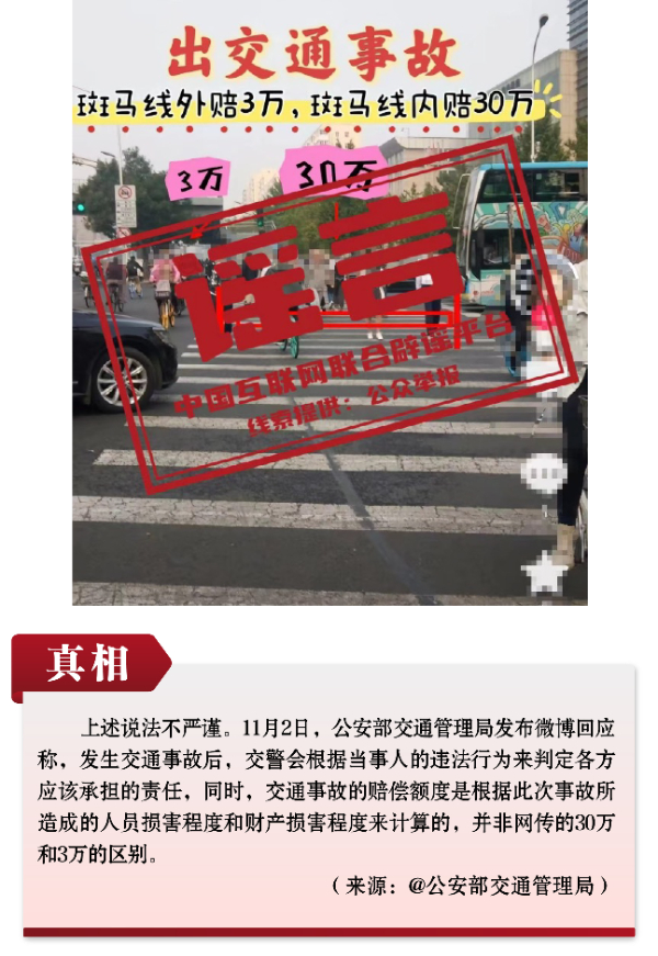 謠言4:行人發(fā)生交通事故,斑馬線外賠償3萬、斑馬線內(nèi)賠償30萬?