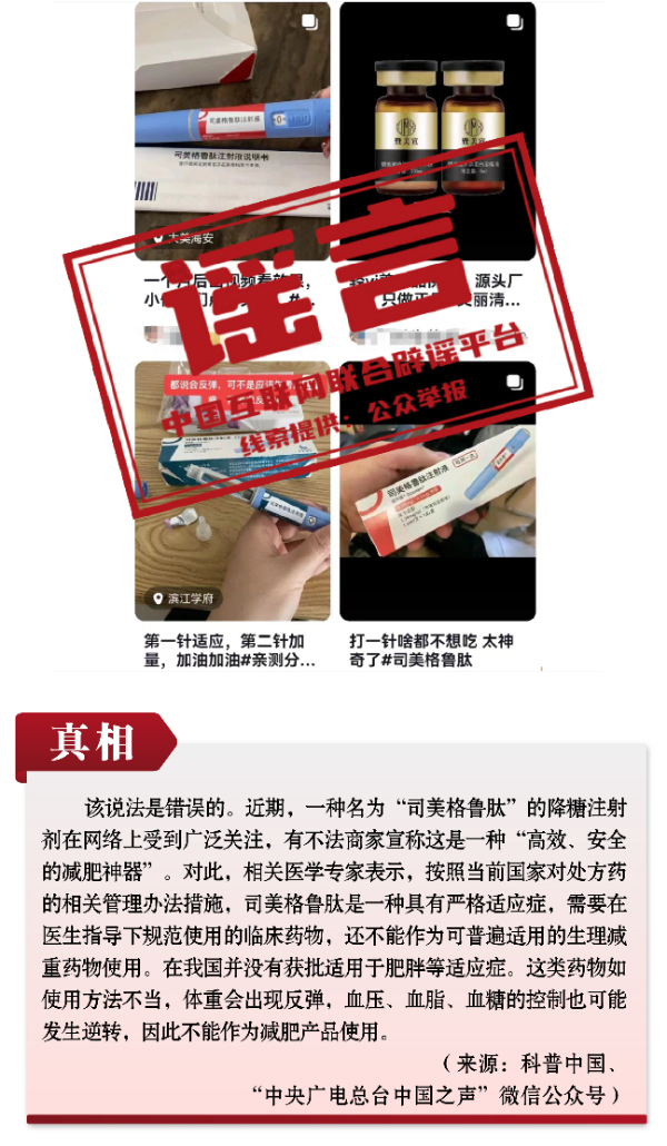 有關(guān)呼吸道疾病防治的謠言和誤區(qū)誤導公眾。隨著各地陸續(xù)入冬,呼吸道疾病進入高發(fā)季節(jié),多種呼吸道疾病交織疊加,難免讓人焦慮。恰在此時,網(wǎng)上一些治病養(yǎng)生醫(yī)藥“偏方”頻出,一些自媒體假借專業(yè)人士和醫(yī)生網(wǎng)上“開方”,真假難辨、誤導公眾。如“感染肺炎支原體會得肺炎、會出現(xiàn)‘白肺’”“可自行給孩子服用阿奇霉素等藥物以預防支原體肺炎”“可網(wǎng)上購買‘醫(yī)院同款’霧化器在家自療”等謠言,抓住人們對疾病的恐懼心理大肆傳播,有的耽誤正常治療,有的則是“假科普、真帶貨”。此外,“使用司美格魯肽能輕松減肥”的謠言,無視權(quán)威部門對處方藥的相關(guān)管理辦法措施,此類藥品若盲目使用或者使用不當,存在很大健康風險。
