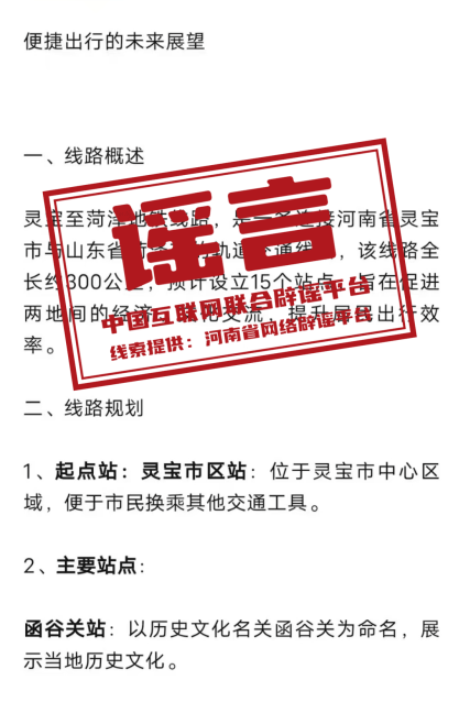 真相:近日,有自媒體賬號在互聯(lián)網(wǎng)平臺發(fā)布“靈寶到菏澤的地鐵”相關(guān)信息,稱“該線路全長約300公里,預(yù)計設(shè)立15個站點(diǎn)”“起點(diǎn)站為靈寶市區(qū)站,位于靈寶市中心區(qū)域”,引發(fā)關(guān)注。經(jīng)核實(shí),該消息系虛假信息。互聯(lián)網(wǎng)不是法外之地,請自覺遵守法律法規(guī),不造謠、不信謠、不傳謠。(來源:“清朗河南”微信公眾號、網(wǎng)信靈寶)