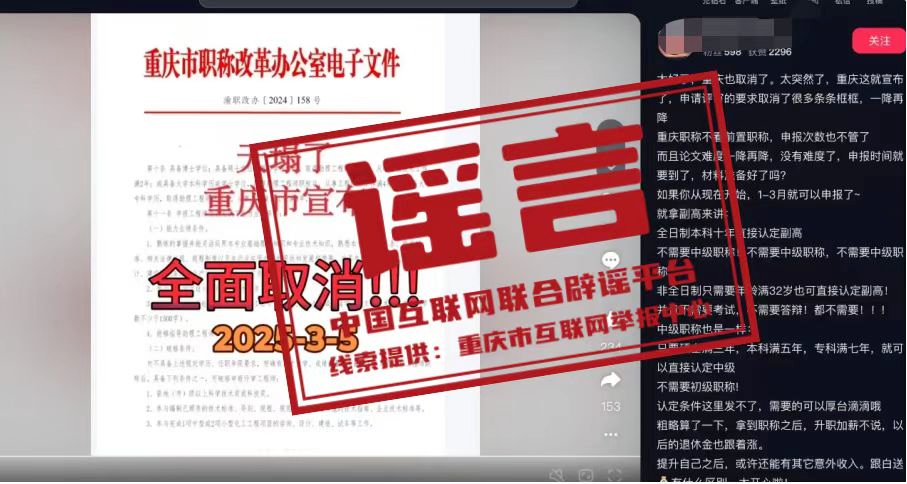 真相:近日,有網民在互聯(lián)網平臺發(fā)布消息稱“重慶市宣布,申請評審的要求取消了很多條條框框,職稱申請不看前置職稱,全日制本科十年直接認定副高,不需要中級職稱”,引發(fā)關注。經核實,網傳信息系謠言。職稱評審均需逐級晉升,取得上一級職稱并滿足相應學歷資歷條件后方可晉升高一級職稱。目前重慶市除特殊人才、博士后等3個針對特定對象的職稱申報綠色通道外,正常申報通道均需逐級晉升。網傳文件是網民通過P圖軟件編輯而成,試圖吸引不明真相的群眾咨詢,借機推銷職稱代辦服務,收取高額費用。目前,謠言線索已轉交公安機關進一步調查處置。(來源:“重慶辟謠”微信公眾號)