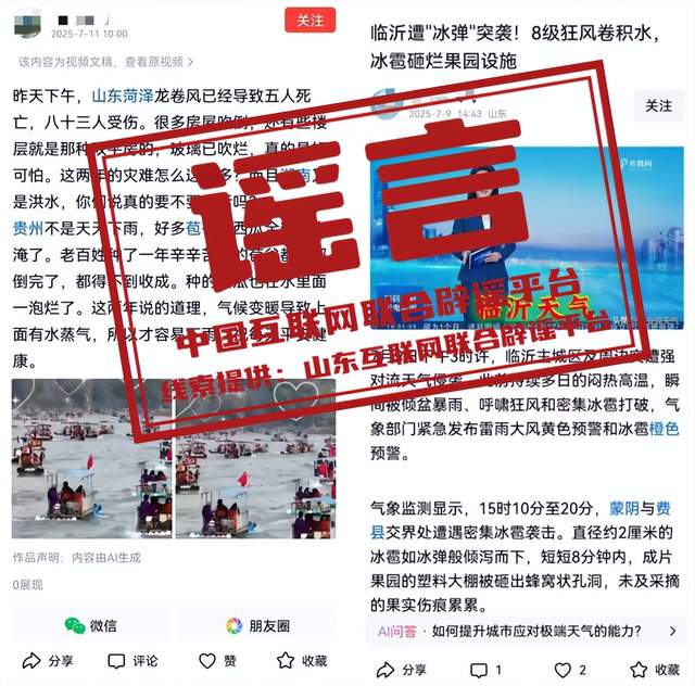 真相:7月11日,有個別自媒體賬號發(fā)布信息稱“昨天下午,山東菏澤龍卷風已經導致五人死亡,八十三人受傷”并配發(fā)相關圖片,引發(fā)關注。經核實查證,菏澤市7月10日并未發(fā)生龍卷風,網傳消息系謠言。此外,另一自媒體賬號近日發(fā)布“臨沂遭‘冰彈’突襲!8級狂風卷積水,冰雹砸爛果園設施”等信息。經向臨沂市氣象部門核實,近期臨沂市未發(fā)生大風冰雹天氣,上述信息與實際情況不符,確為謠言。請廣大網民以氣象部門發(fā)布的信息為準,勿輕信、勿傳播非正規(guī)來源或未經證實的信息。(來源:山東省互聯網違法和不良信息舉報中心)